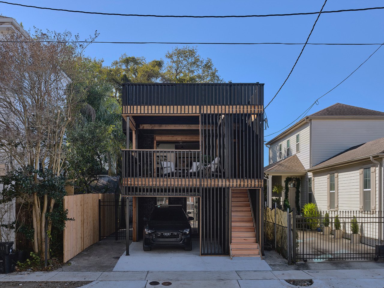 Rather than seeing the project as several tacked-on elements working in disharmony with the existing façade, NFA sought to unify them with cohesive, organizing elements that could serve as a new front façade re-defining the street presence of the building as a whole. The idea was for the porch to appear as a balloon framed exoskeleton that surrounded the addition with a consistent veil, creating privacy and a dynamic visual experience that varies from opaque at acute angles to more transparent at perpendicular ones. It allows for both privacy and public (longer distance) views from the interior, shifting your range of focus based on need (or desire) from privacy. For the project to remain on budget, most of the material was dimension lumber with painted (black) #1 grade used as the perimeter framing and key elements highlighted in clear stained cedar behind at the floor perimeter, the stairs and framed openings.